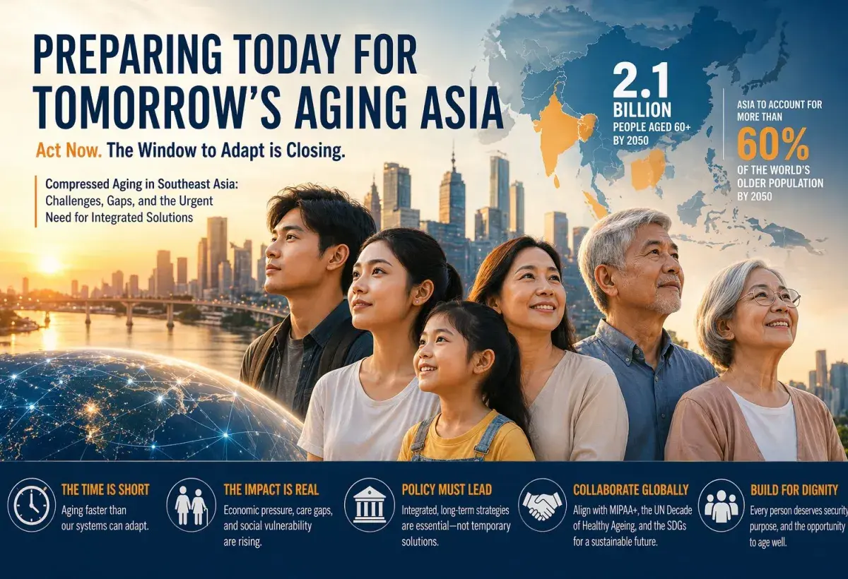 The evidence presented throughout this article converges on a single, unavoidable conclusion: Southeast Asia is not approaching an aging transition as it is already inside one, and the window to respond is rapidly narrowing. Compressed aging across ASEAN has fundamentally altered the timeline for policy action, leaving governments with little margin for delay or incremental reform. What makes this moment more consequential is that the “future elderly” are not a distant demographic, they are today’s younger and working-age populations. By 2050, the projected 2.1 billion people aged 60 and above globally will largely come from those currently in their late 20s onward, living in a world where longevity is no longer debated but expected, with life expectancy ranging between 72 and 86 years across countries. Nowhere is this shift more concentrated than in Asia, which is projected to account for more than 60% of the global older population. This reality reframes aging not as a future burden, but as a present structural transformation that will redefine labor markets, healthcare systems, family structures, and economic sustainability within a single generation.